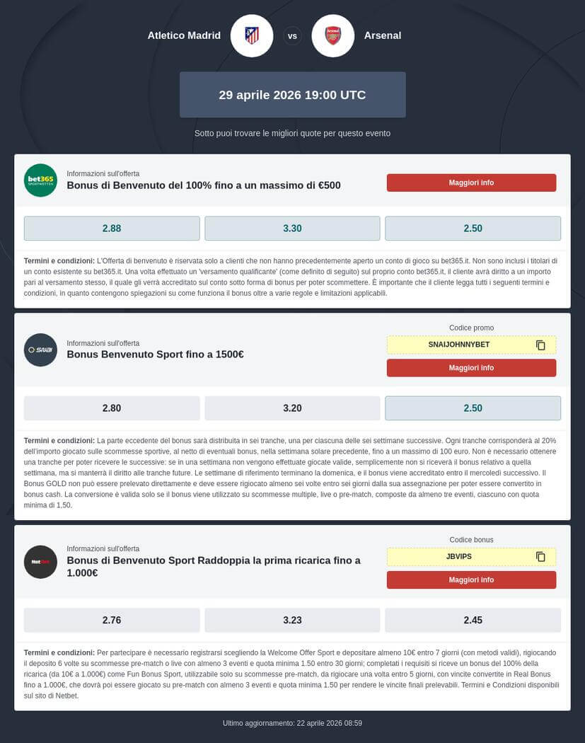Per trovare le migliori quote Atletico Madrid - Arsenal è disponibile bet365. Ad esempio, bet365 quota l'1 a 2.88, l'X a 3.30 e il 2 a 2.50. Continua a seguirci per ulteriori novità e aggiornamenti sul pronostico Atl. Madrid - Arsenal.