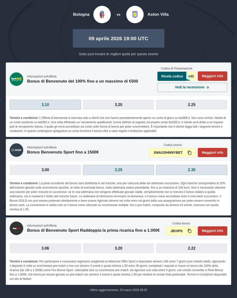 Ecco arrivato il pronostico scommesse Bologna - Aston Villa di Europa League. La partita si giocherà allo Stadio Renato Dall'Ara di Bologna, il 9 aprile 2026, alle 21:00 italiane. Per studiare le migliori quote scommesse Bologna - Aston Villa ci affideremo ai migliori bookmakers sulla piazza, ovvero bet365, SNAI e Netbet che, ad esempio, quota l’1 a 3.05, quota l’X a 3.20 e quota il 2 a 2.32. Continua a leggere questo articolo per approfondire il nostro pronostico Bologna - Aston Villa Europa League.