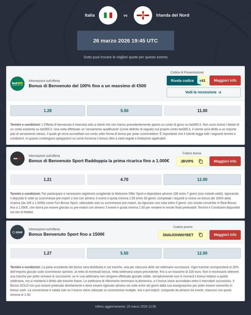 Per sfruttare le migliori quote Italia - Irlanda del Nord Qualificazioni Mondiali, il nostro consiglio è fare affidamento su SNAI, bet365 e Netbet. Ad esempio, bet365 quota l’1 a 1.30, bet365 quota l’X a 4.75 e il 2 è quotato da bet365 a 8.50. Continua a seguirci per ulteriori novità e aggiornamenti sul pronostico scommesse Italia - Irlanda del Nord.